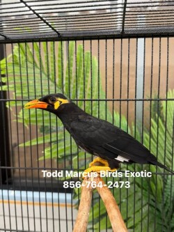 Male Greater Indian Hill Mynah available! He is hand tame and a very outgoing little guy. He was hand raised and loves his mazuri and fruit. All our birds are very well socialized and used to everyday household activity. At Birds Exotic you can trust in our 35 years of unmatched experience and quality. We offer a 1 month genetic health guarantee on all weaned baby birds (see our guarantee tab) and gender analysis for all babies over $1500.00. Shop our online store for all of your bird supply needs at thebirdstore.com. Please call us at 856-764-2473 or email us at toddmarcusbirds@aol.com with any questions.