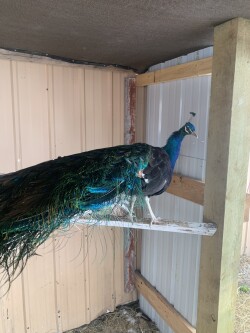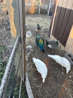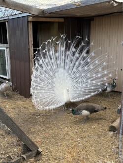 The white peacock pictured is the black shoulder hens father that has the 3 chicks