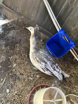 1.5 years old adult peahen, rare color breed. Mild mannered and healthy. Silver Pied is a rare and striking color variety with mostly white plumage and light silver accents.