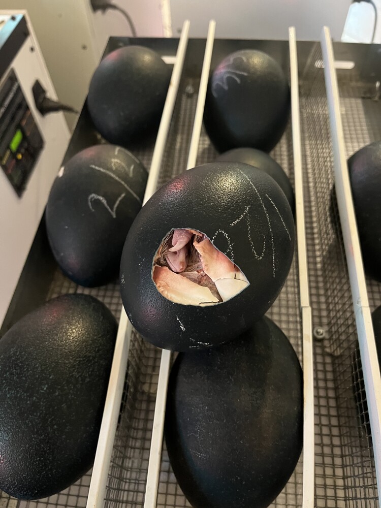 Emu chicks are expected to hatch out April 30th. Standards are 250 and blondes are 450. Chicks will be at least a week old before being picked up. All chicks will be related.