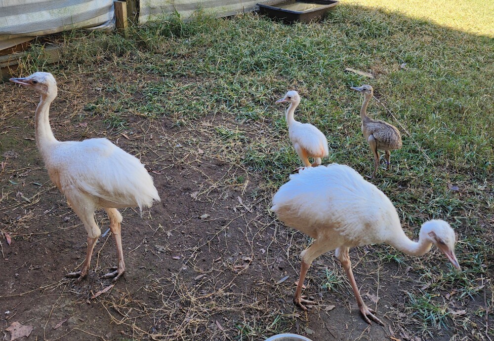 Rhea chicks looking for a new farm. Pair #1: Unrelated White male and White female rhea chicks. The white male was hatched on August 2nd, and the white female was hatched on October 3rd. $600 for the pair. Trio#2: Unrelated White female and two...